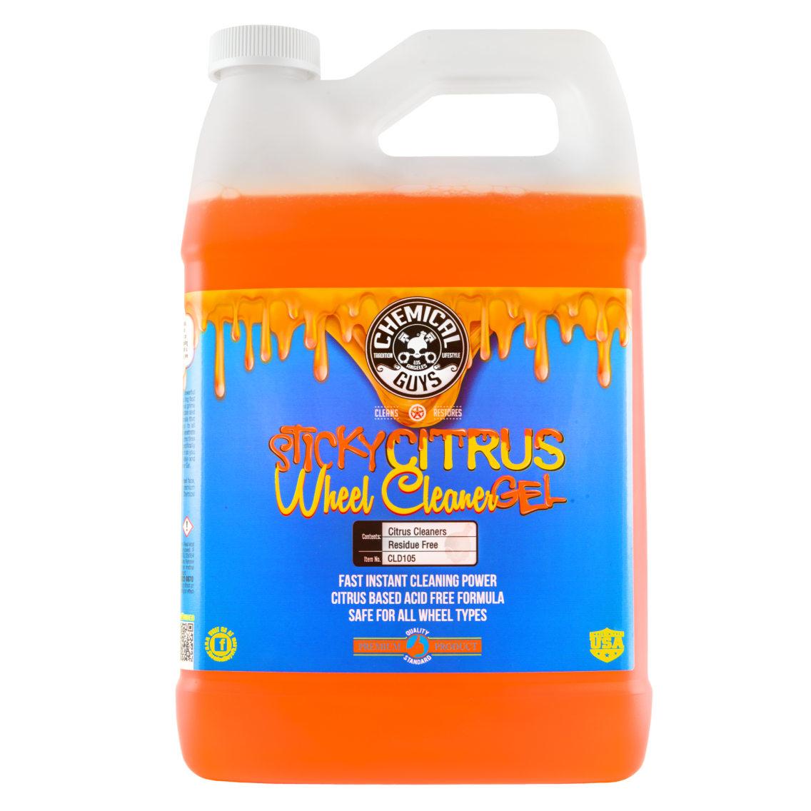 Sticky Citrus clings to wheels and vertical surfaces, suspending road grime, brake dust, oil, and dirt and then lifting it off the wheel safely and gently. Sticky Citrus sticks hard to keep the cleaning power where you need it, without rolling off the surface. Spray Sticky Citrus over filthy wheel parts, and watch as it sticks to the filthiest surfaces for a deeper clean using less product!